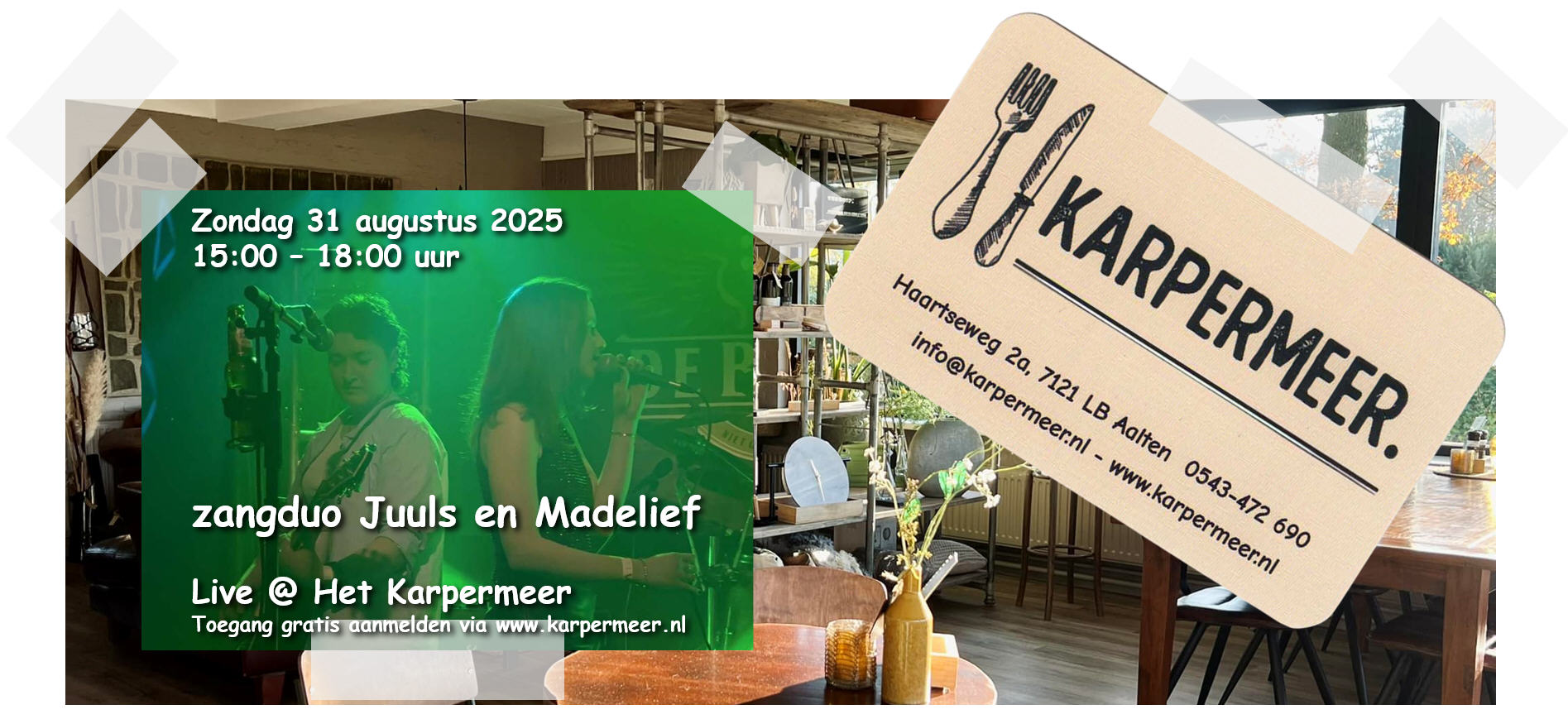 Het Karpermeer Haartseweg 2a, AaltenZondag 22 juni 2025 geeft niemand minder dan Ed Struijlaart een leuk kamerconcert bij ons in Het Karpermeer, de toegang is gratis maar aanmelden is wel wenselijk zodat wij ongeveer weten hoeveel mensen aanwezig zullen zijn. Uiteraard is het ook weer mogelijk om na het concert bij ons een hapje te blijven eten, we werken […]
