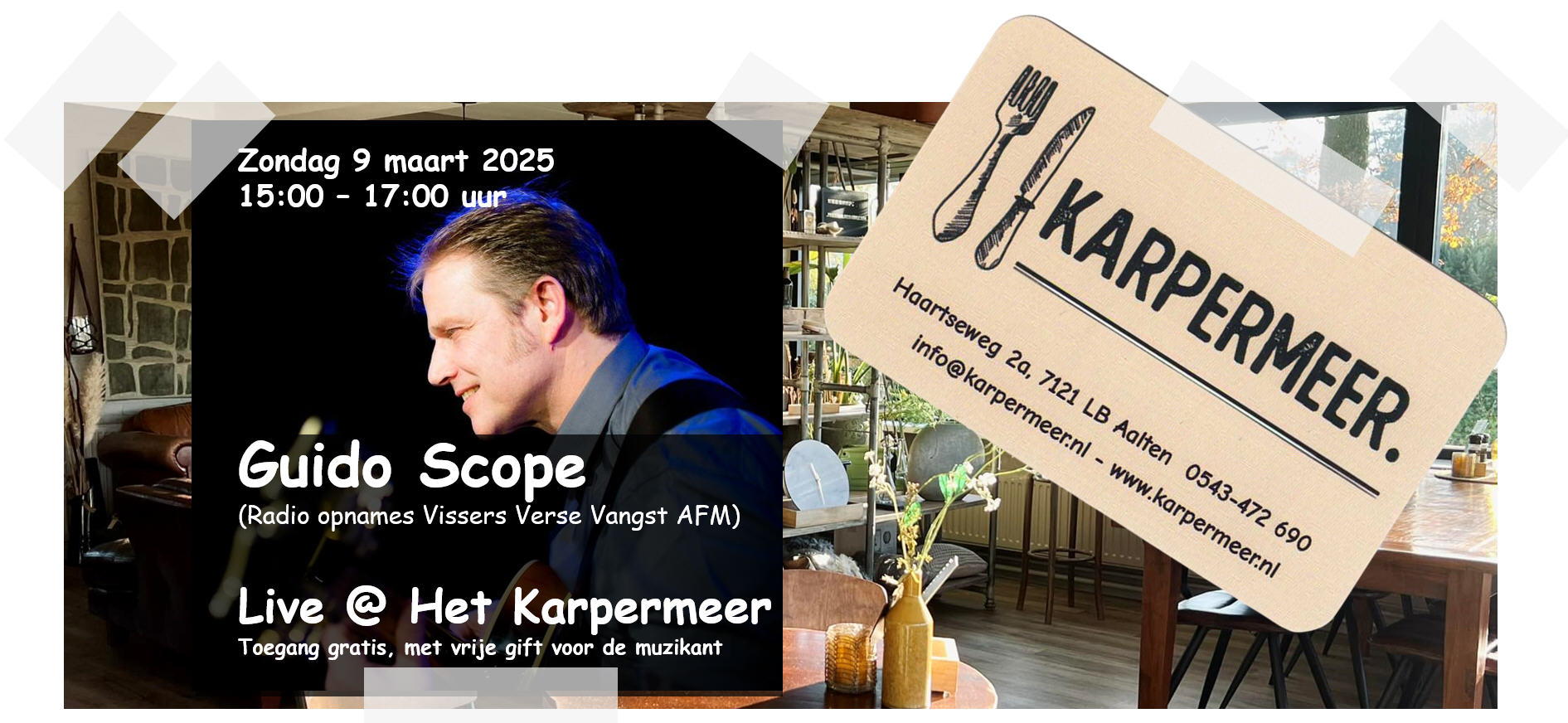Met zang en 7 snarige gitaar zet Guido een hele sterke solo act neer. Eerder (2023) was Guido Scope al te gast in Vissers Verse Vangst en speelde toen onder andere live het nummer Listen to my heart wat afgelopen 31 januari uitkwam op onder andere Spotify. Van het optreden wat Guido Scope zondag 9 maart geeft bij Het Karpermeer zullen ook radio opnames gemaakt worden die de week erna zullen worden uitgezonden op AFM en Beatstad Radio.