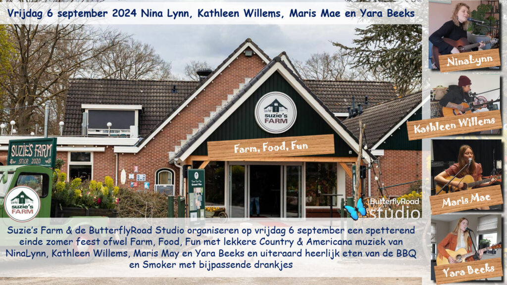 AALTEN – Vrijdagavond 6 september organiseren Suzie’s Farm en de ButterflyRoad studio uit Aalten een geweldig einde zomer Country/Americana feest bij Suzie’s farm in Aalten met op het podium de geweldige singer-songwriters Nina Lynn, Kathleen Willems, Maris Mae en Yara Beeks. De toegang is gratis en indien gewenst kan er voorafgaande aan de optredens een BBQ arrangement bij geboekt worden om alvast heerlijk in de Country sfeer te komen.